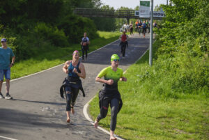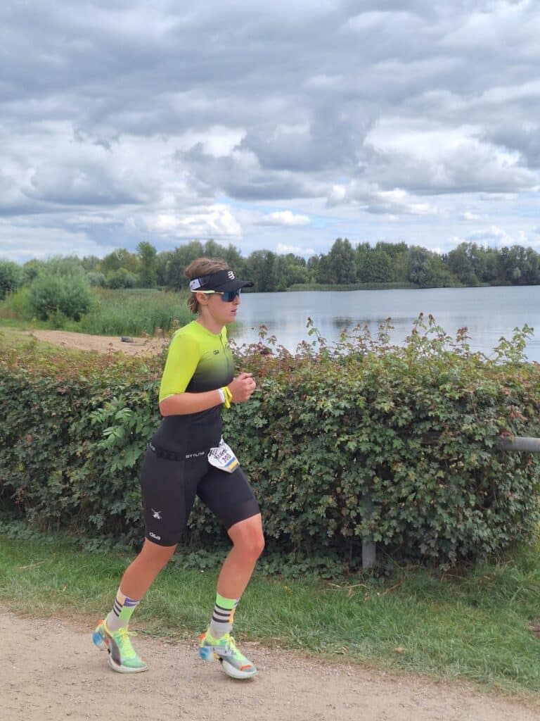 En dan het hardlopen. De eerste kilometer voelt altijd raar na het fietsen. Begin rustig, 15-20 seconden per km langzamer dan je normale tempo. Na een kilometer of twee vallen je benen vanzelf in hun ritme en kun je lekker doorlopen naar de finish.